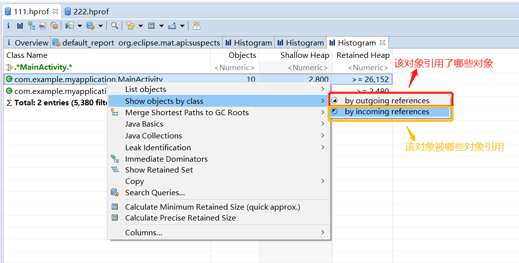 8、通过上图看到了MainActivtiy在旋转屏幕后产生了10个实例,再去查看MainActivtiy具体被哪些对象引用了,右键MainActivtiy实例选择by incoming references