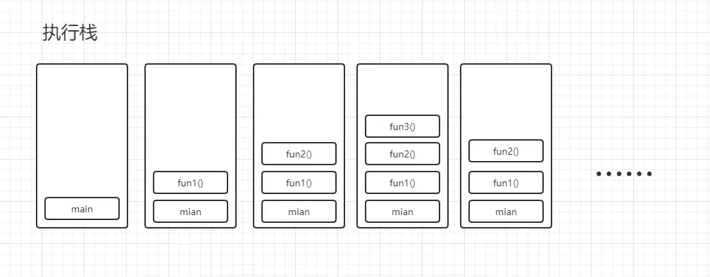 上面这列出来的一个个函数,就是一个执行栈。这里我用一个更详细的图解来表示一下执行栈的运行过程: