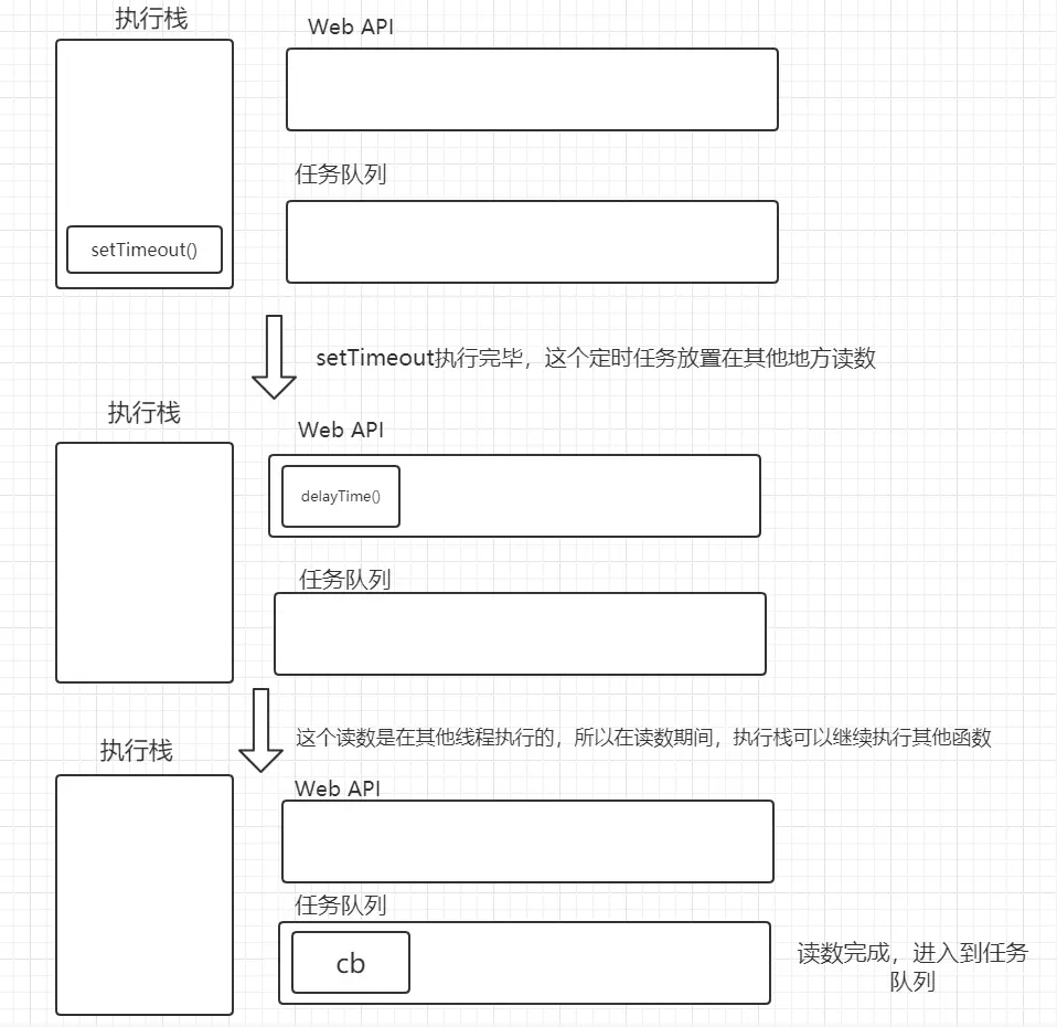 setTimeout发起的定时器是在定时器触发线程并发进行,读数完毕,回调交给事件触发线程中的task queue。所以,此时任务队列中有一个待执行的task。 - 执行栈将这个