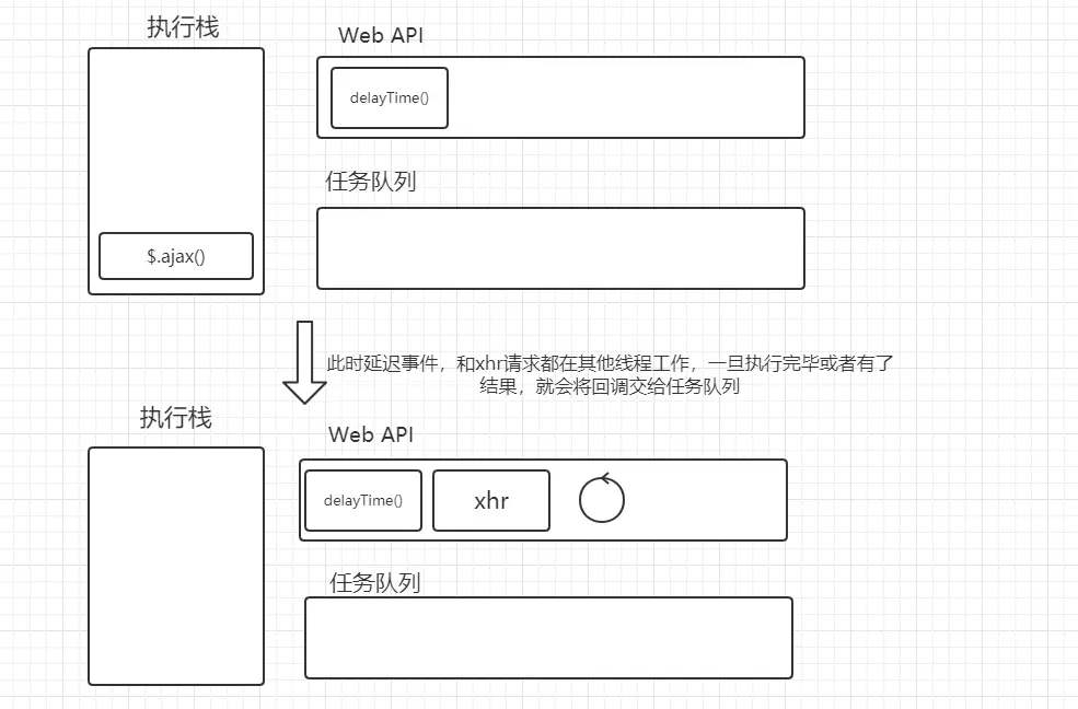- 第三步,发起Ajax请求,请求的过程也是在其他线程并行执行(http请求线程)的,请求有了结果以后,回调函数加入事件触发线程的任务队列。