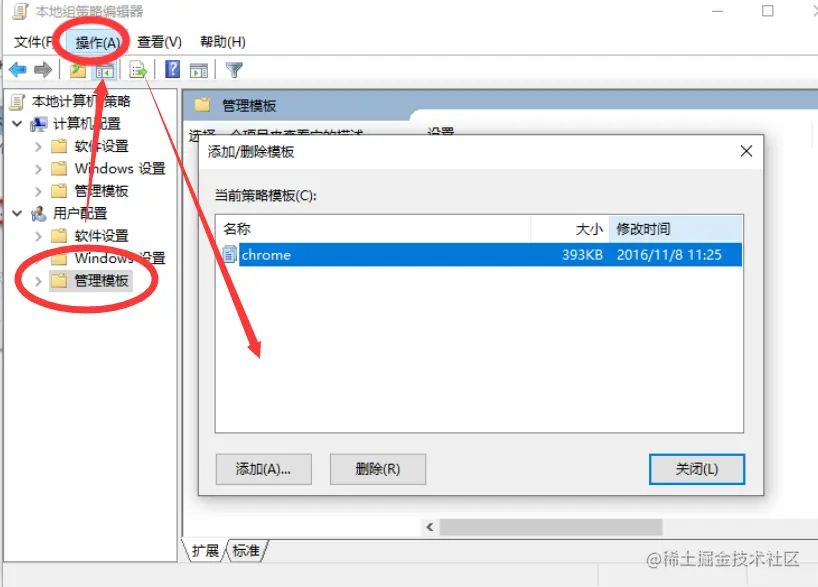 policy_templates文件夹中找到windows\adm\zh-CN\chrome.adm运行win+R中输入gpedit.msc打开本地组策略(此操作需要win10专业版或更高,家庭版无本地组策略,激活码百度一大堆),依次点击管理模板→操作→添加/删除模板→添加→选择chrome.adm并添加 - 在