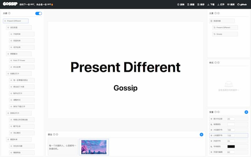 一个制作幻灯片的在线工具,只需要少量拖拽和对齐操作,就可以生成通过浏览器播放的幻灯片。