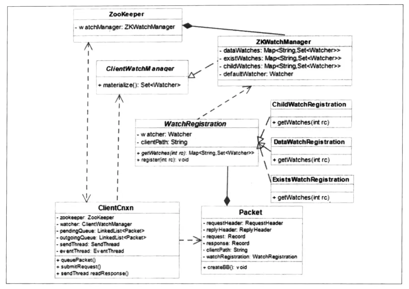 在ZooKeeper中,Packet 可以被看作一个最小的通信协议单元,用于进行客户端与服务端之间的网络传输,任何需要传输的对象都需要包装成一个Packet对象。 因此,在ClientCnxn中WatchRegistration又会被封装到Packet中去,然后放入发送队列中等待客户端发送。