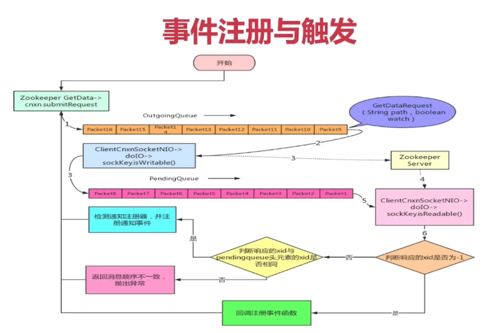 - 当Zookeeper向客户端发送一个Watcher事件通知时,客户端就会对相应的process方法进行回调。