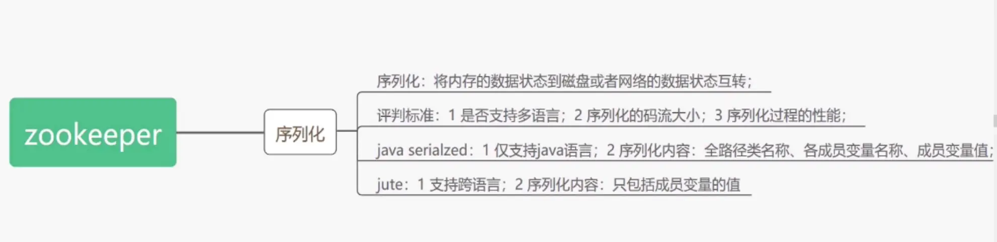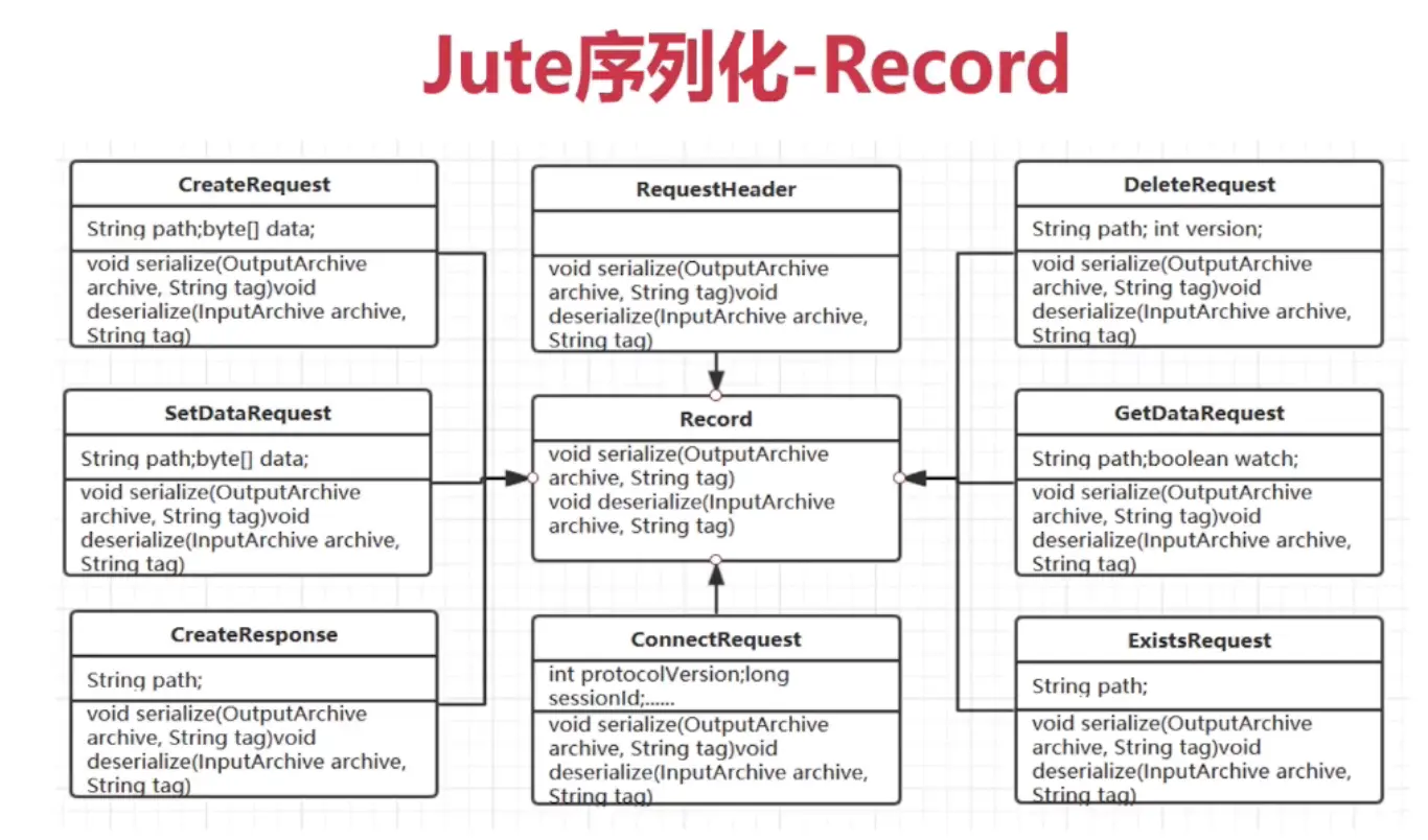 所有需要序列化的类都必须实现Record接口。 在serialize和deserialize方法中,OutputArchive/InputArchive类是Jute底层真正用来做序列化和反序列化的类,并且它们可以为多个对象进行序列化/反序列化操作,这也是方法中tag存在的作用,用来标识对象。