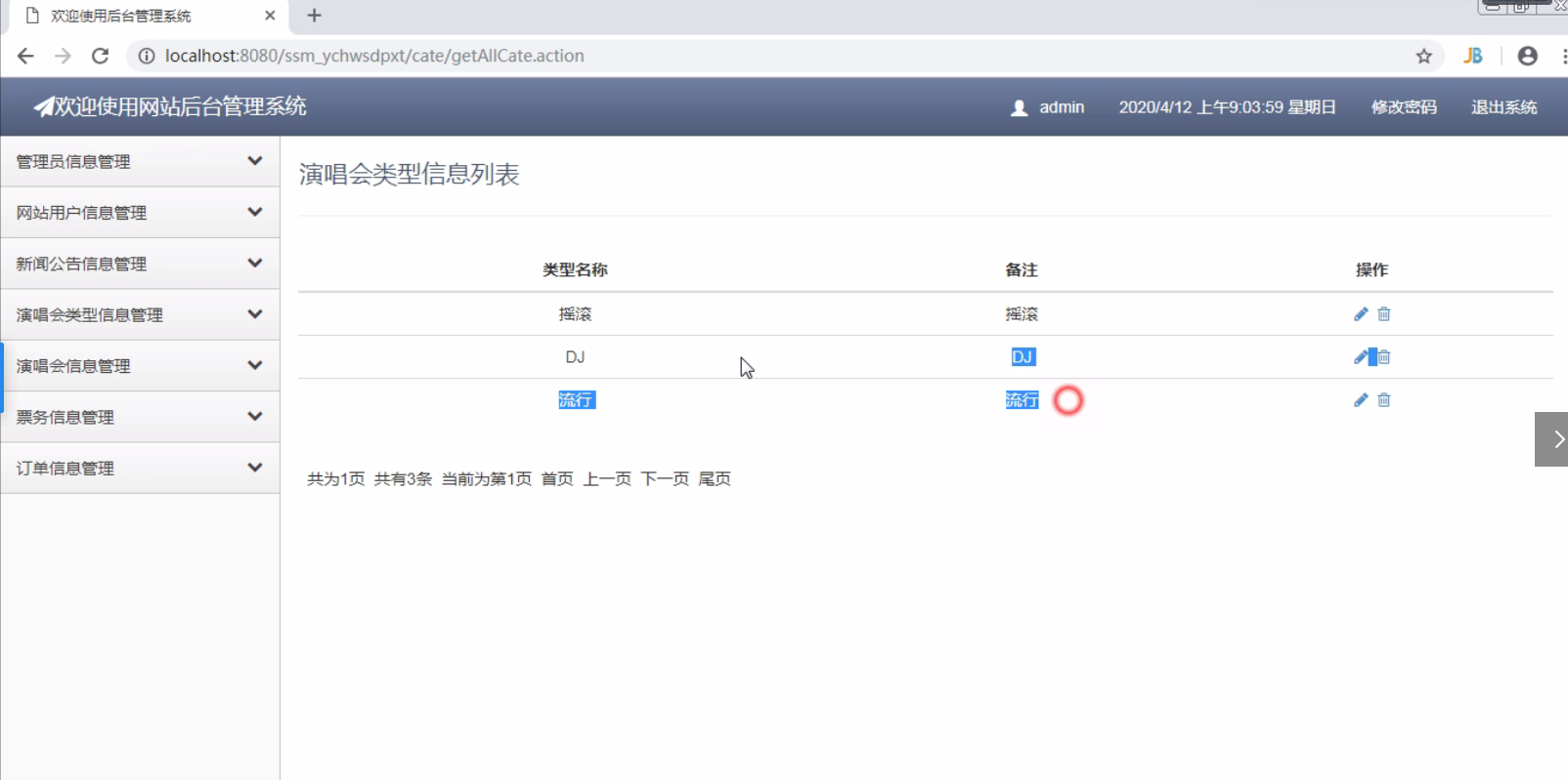 系统中的核心用户是系统管理员,管理员登录后,主要功能有管理员信息管理、网站用户管理、新闻公告信息管理、演唱会类型信息管理、演唱会信息管理、票务信息管理、订单信息管理。