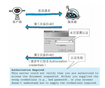 返回含有 401 的响应必须包含一个适用于被请求资源的 WWW- Authenticate 首部用以质询(challenge)用户信息。当浏览器初次接收 到 401 响应,会弹出认证用的对话窗口。