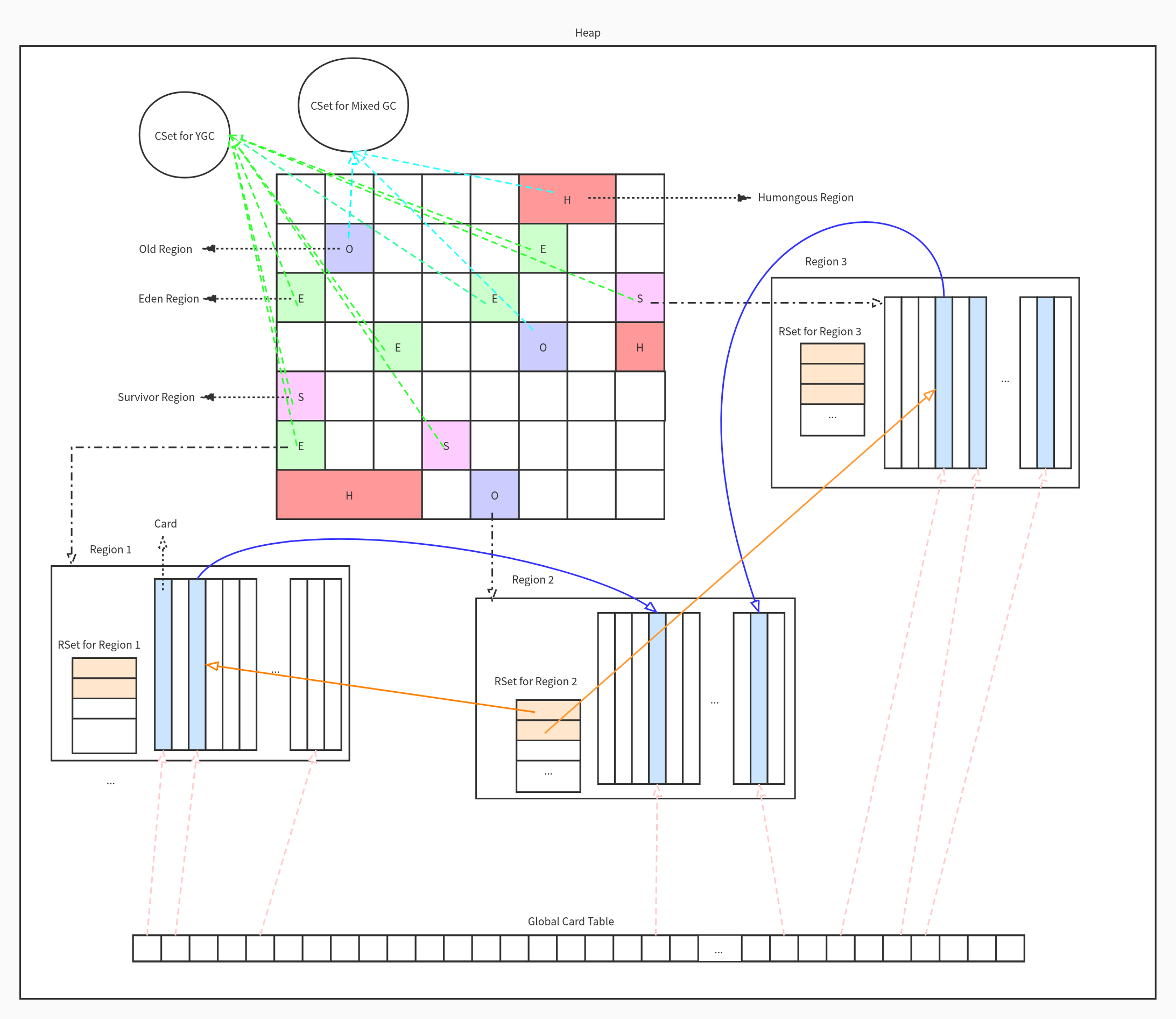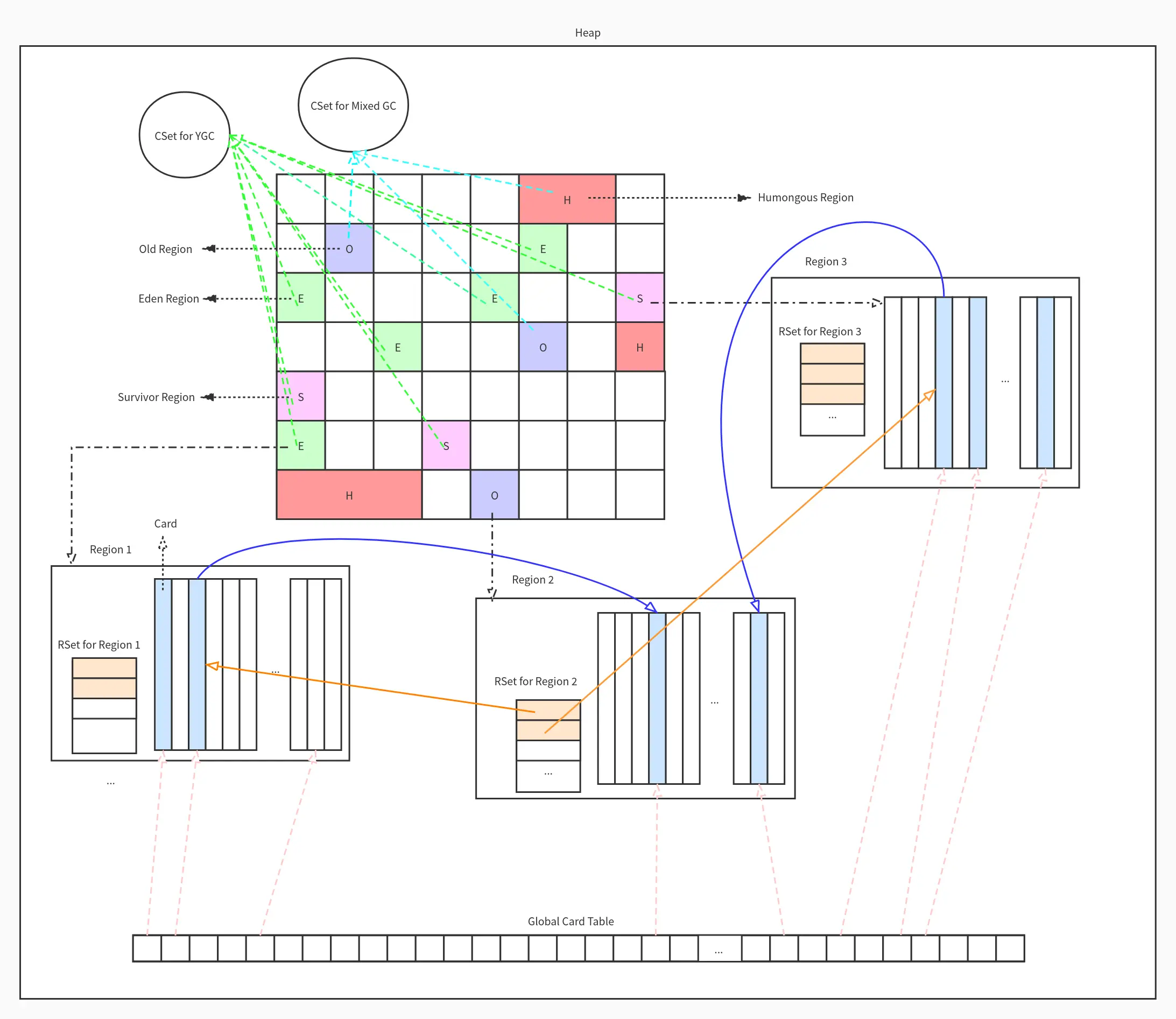 然而G1为了避免STW式的整堆Heap扫描,在每个分区Region记录了一个已记忆集合(RSet),内部类似一个反向指针,记录引用分区Region内对象的卡片Card的索引。