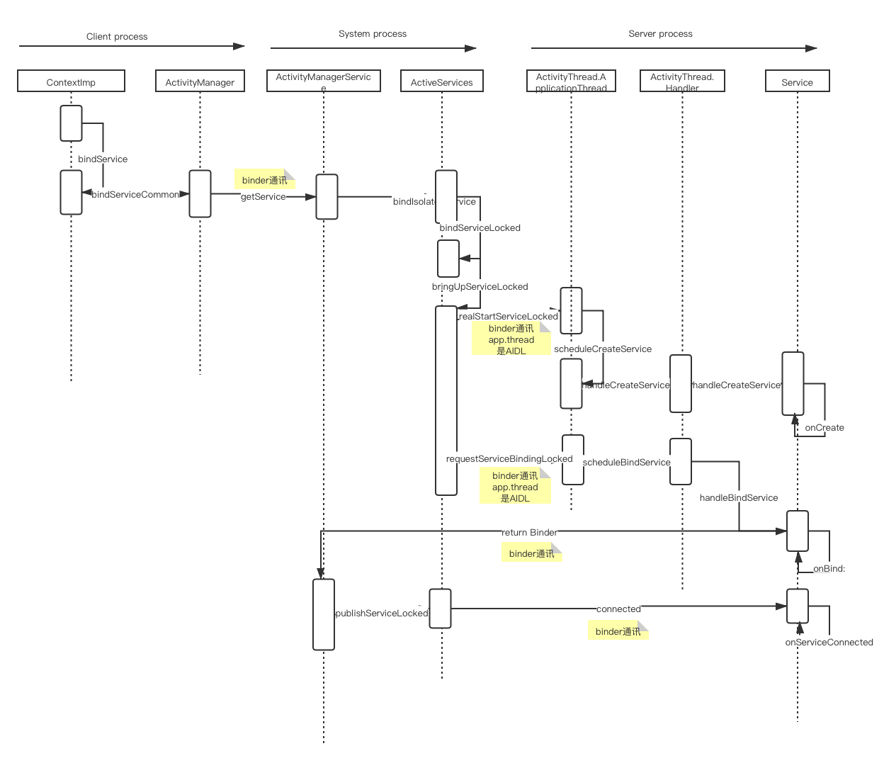 2)图中涉及到三个进程之间的交互,Client process & System process & Server process