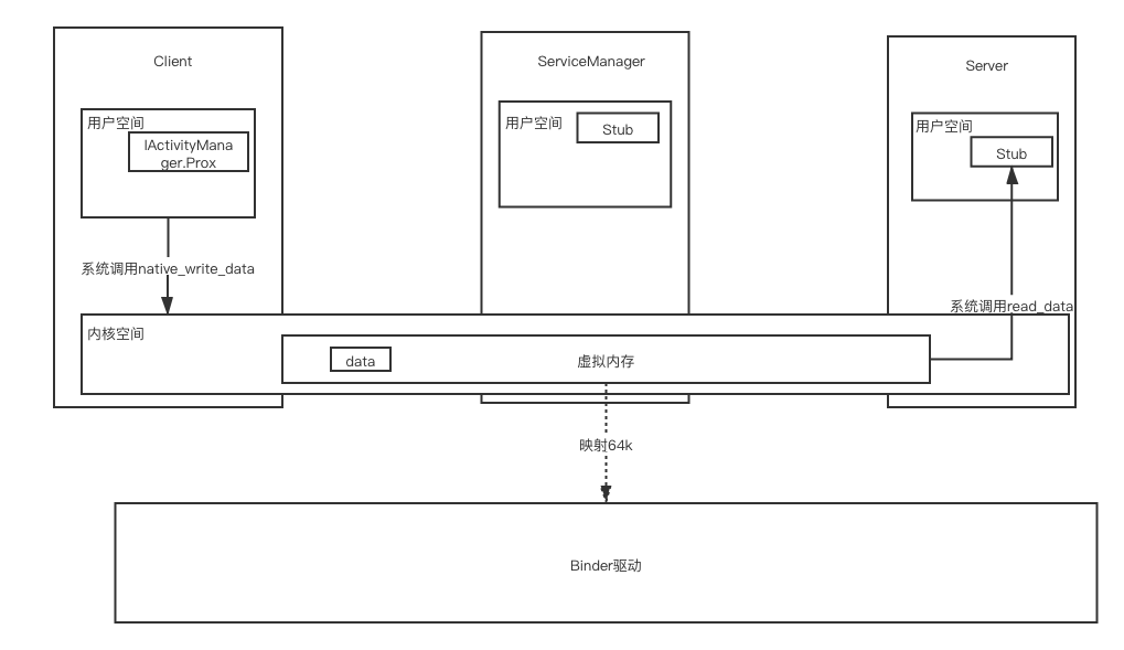 1、client端通过binder机制,用系统调用写data到内核空间的虚拟内存中。