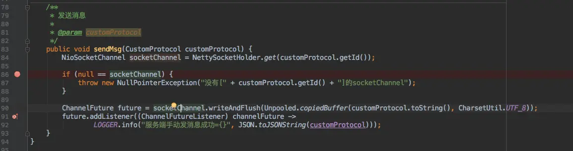 | 123 | String telNo = NettyAttrUtil.getClientId(ctx.channel());NettySocketHolder.remove(telNo);log.info("客户端下线,TelNo=" + telNo); |