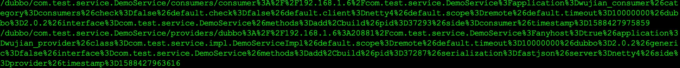 其中configurators和routers并不常用,主要在配置和服务治理的时候才会用到。常用的是providers和consumers。如果一个服务有N个Provider,那在providers下面会产生N个子节点。同样的,如果一个服务有N个Consumer,那在consumers下面会产生N个子节点。关于子节点中对服务的描述会比较长,这边给出一个示意图,调试代码的可以直接登录到Zookeeper查看自己的服务情况。