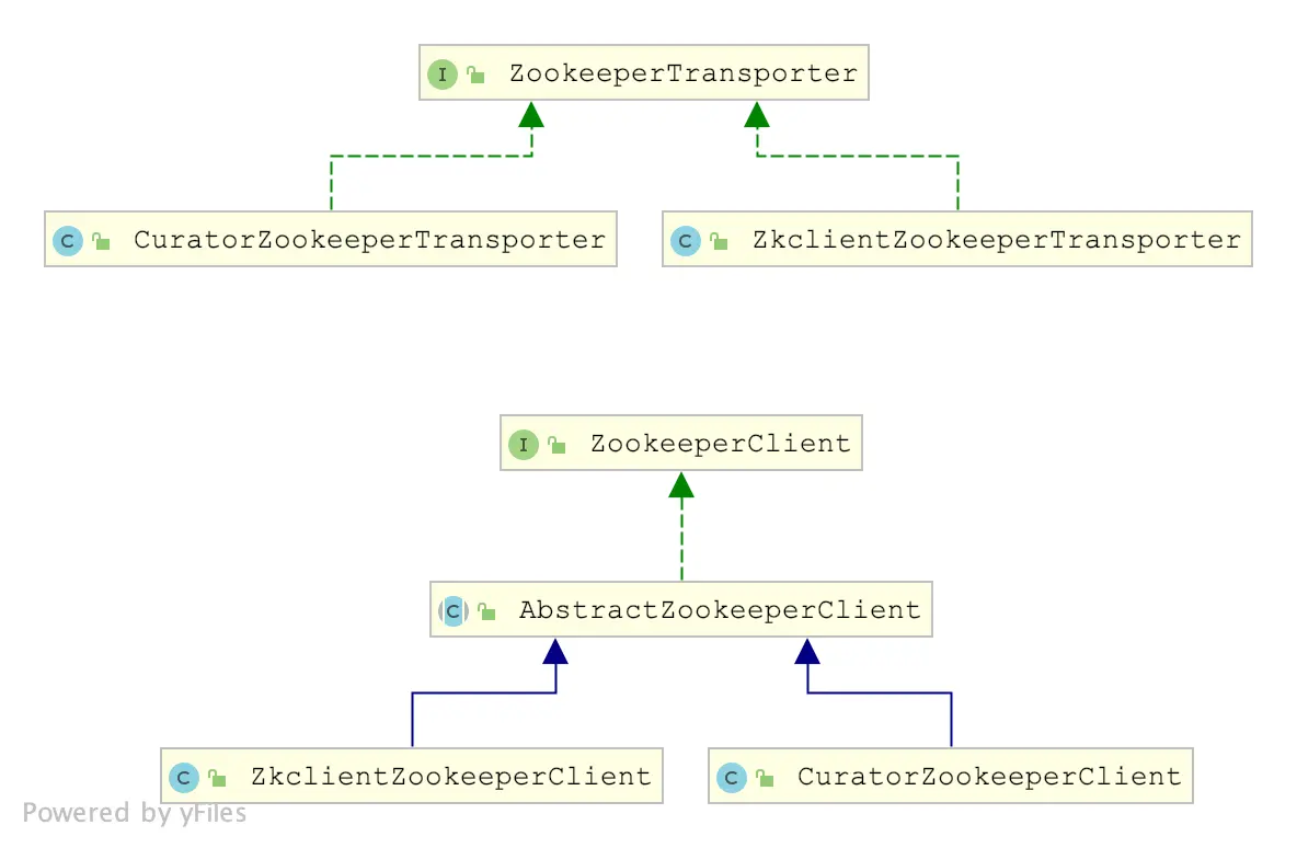 Dubbo为了兼容多个zk客户端,还搞了一个Zookeeper的Transprter层。官方给出了2种实现,分别是curator和zkClient。看下类图结构。