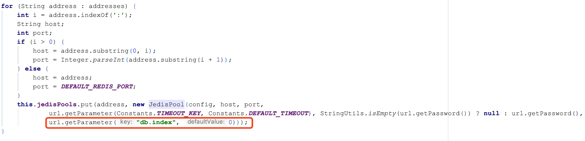 还是上面这个问题的文章,解决方案是把JedisPool的源码修改下,在初始化的时候,把DB给写死,我去,这操作。。。也没的说了。