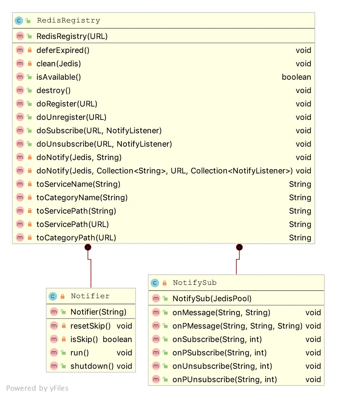 以上两个问题,直接看下源码就能猜到解决方案了。下面说下RedisRegistry的实现。
