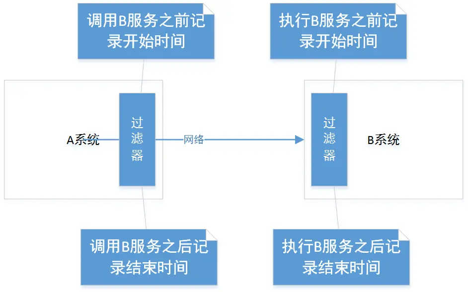 ② A调用B服务的耗时(网络耗时+B服务的执行耗时)
