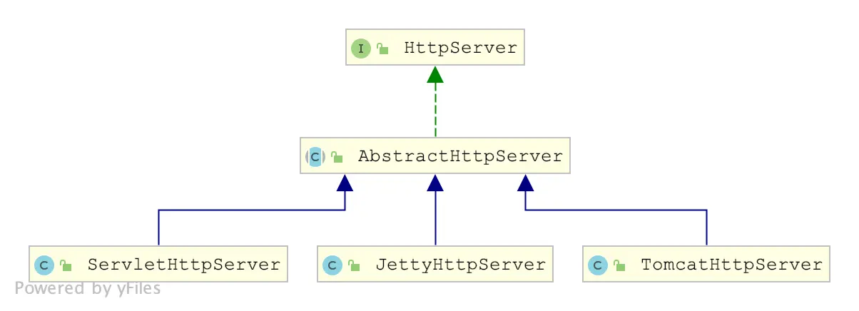 Dubbo为了适配各种Http服务器(Tomcat,Jetty)抽象出了一个HttpServer的接口。这个思想与文章dubbo的transporter层类似。都是使用了桥梁模式,关于dubbo对桥梁模式运用,可以参考这篇文章,只不过这边HttpServer比较简单。看下它的类结构。