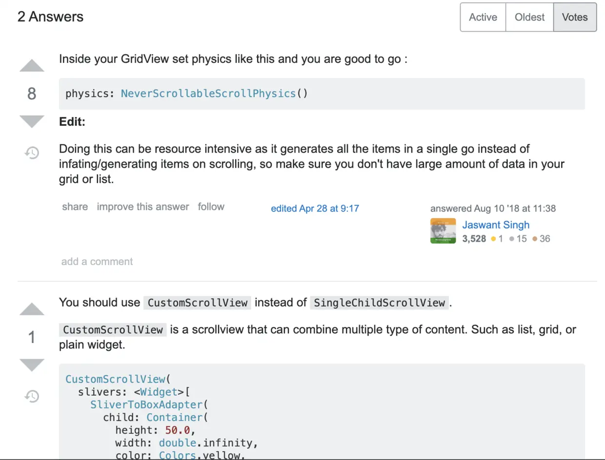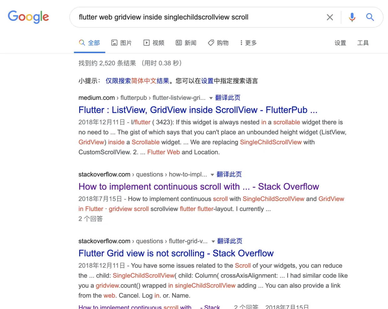 顺着我们的问题,在google中搜索flutter web gridview inside singlechildscrollview scroll 等关键字 如图所示