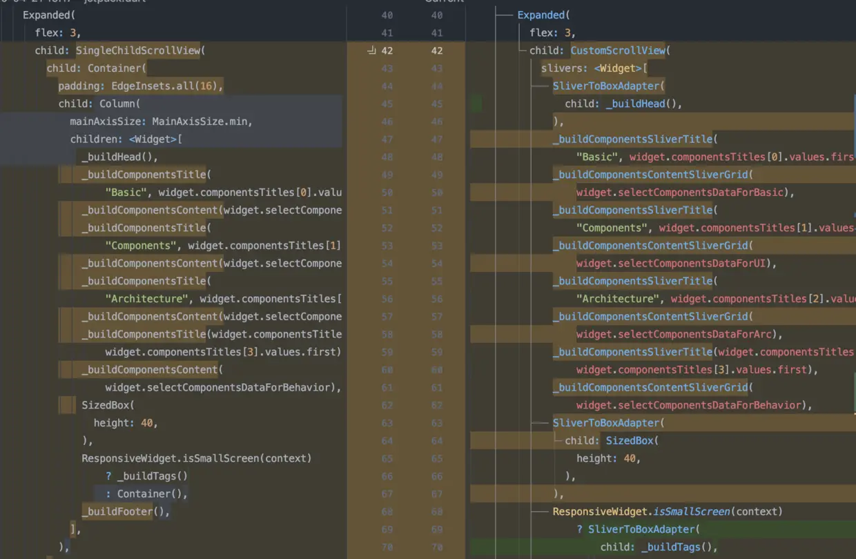 - IndexedSemantics, 意思是为子View添加一个索引,用来通知滚动位置。 注意:目前为止CustomScrollView的第一层子View必须是以上组件的构成,官方文档还少写了一个SliverToBoxAdapter,它同样是针对CustomScrollView来实现的特殊组件,看它的构造函数只有一个Key和child,其实他就是一个实现了CustomScrollView Scrollable的一个容器,用来作为CustomScrollView的第一层子View。大致对它有了认识之后,我们来改造一下我们原来的实现。