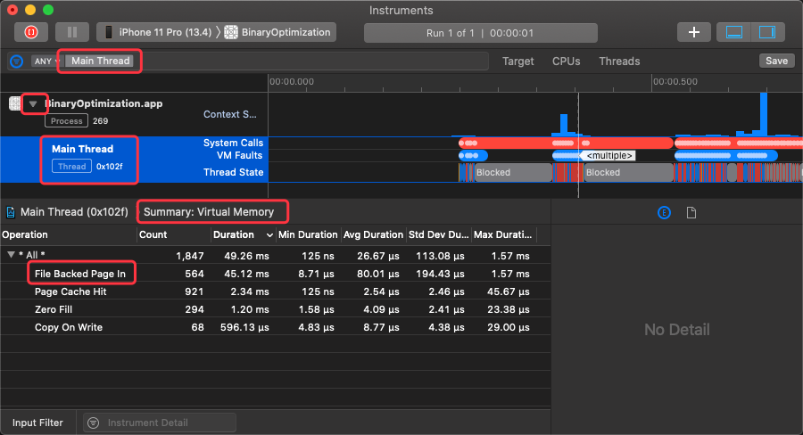 点击录制⏺后,出现第一个页面,马上停止⏹。过滤只显示Main Thread相关,选择Summary: Virtual Memory。