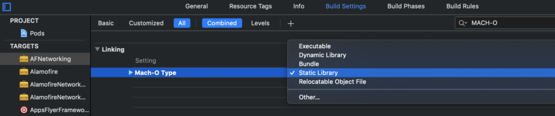 在Pod的工程中,选择我们使用的库,然后点击Build Settings,搜索或者找到Mach-O Type设置,修改Mach-O Type为Static Library。