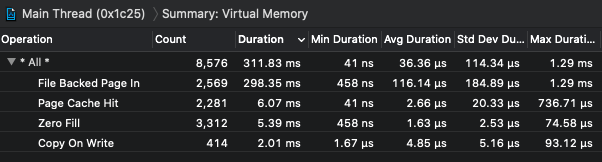 对比冷启动和热启动的File Backed Page In次数,可以看到热启动情况下,触发的Page Fault的次数就变得很小了。