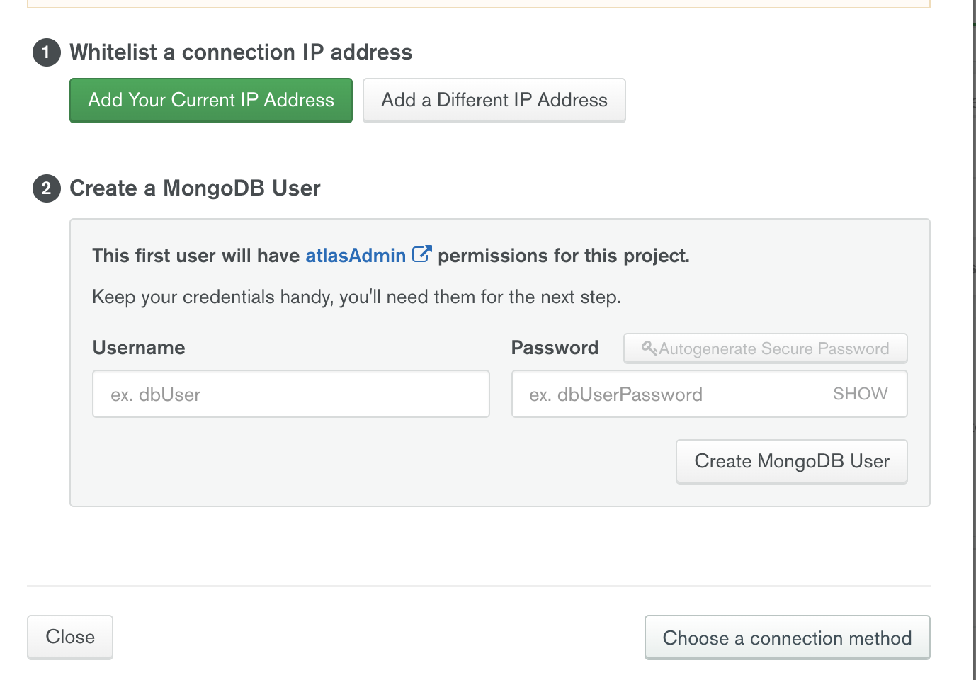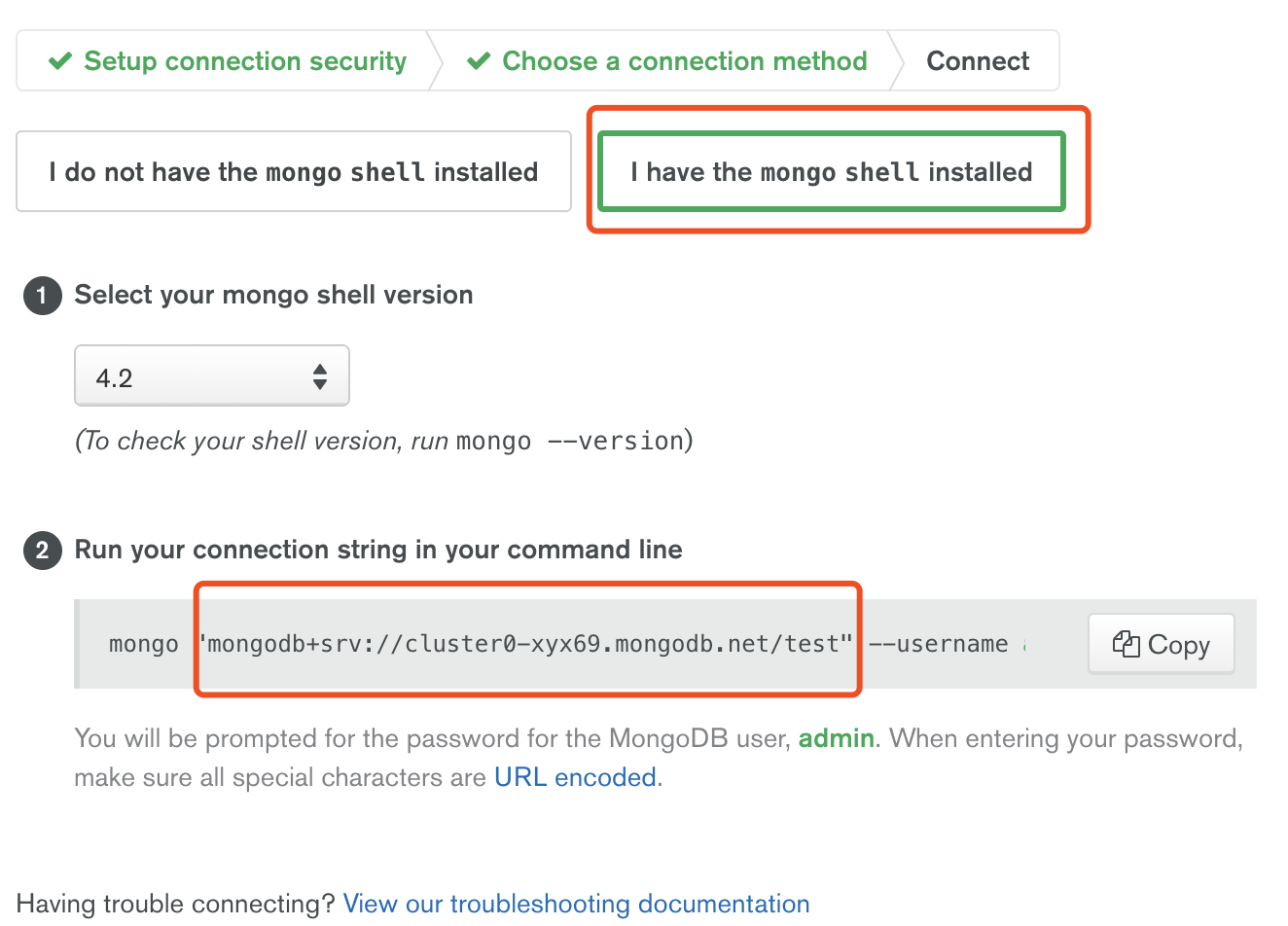下一步,这里说给你三种连接方式,都是很简单的英语,大家自行体验。第二种方式会有各种类型的代码连接mongo的写法哟~!我要用到第一个。