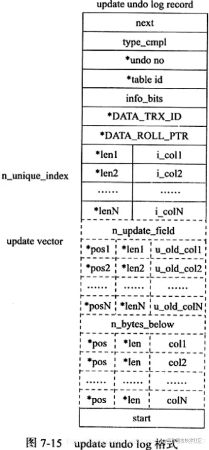 update undo log记录的是对 delete和 update操作产生的 undo log。该undo log可能需要提供MVCC机制,因此不能在事务提交时就进行删除。提交时放入undo log链表,等待 purge线程进行最后的删除。 update undo log的结构如图7-15所示。