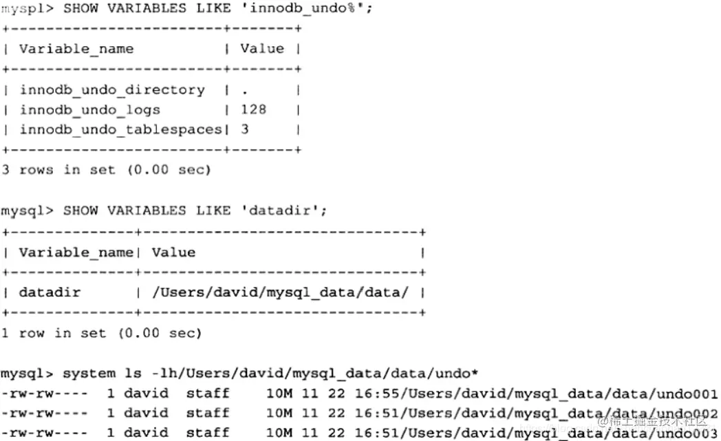 参数innodb_undo_tablespaces用来设置构成 rollback segment文件的数量,这样 rollback segment可以较为平均地分布在多个文件中。设置该参数后,会在路径innodb_undo_directory看到undo为前缀的文件,该文件就代表 rollback segment文件。下图的示例