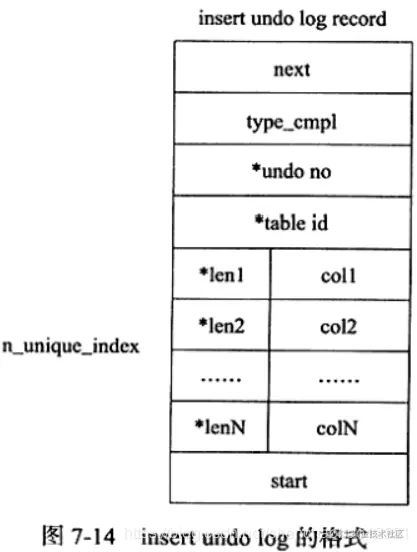 图7-14显示了 insert undo log的格式,其中为表示对存储的字段进行了压缩 insert undo log开始的前两个字节next记录的是下一个 undo log的位置,通过该next的字节可以知道一个 undo log所占的空间字节数。类似地,尾部的两个字节记录的是 undo log的开始位置。 type_cmpl占用一个字节,记录的是undo的类型,对于 insert undo log,该值总是为11。undo no记录事务的ID, table id记录undo log所对应的表对象。这两个值都是在压缩后保存的。接着的部分记录了所有主键的列和值。在进行 rollback操作时,根据这些值可以定位到具体的记录,然后进行删除即可。