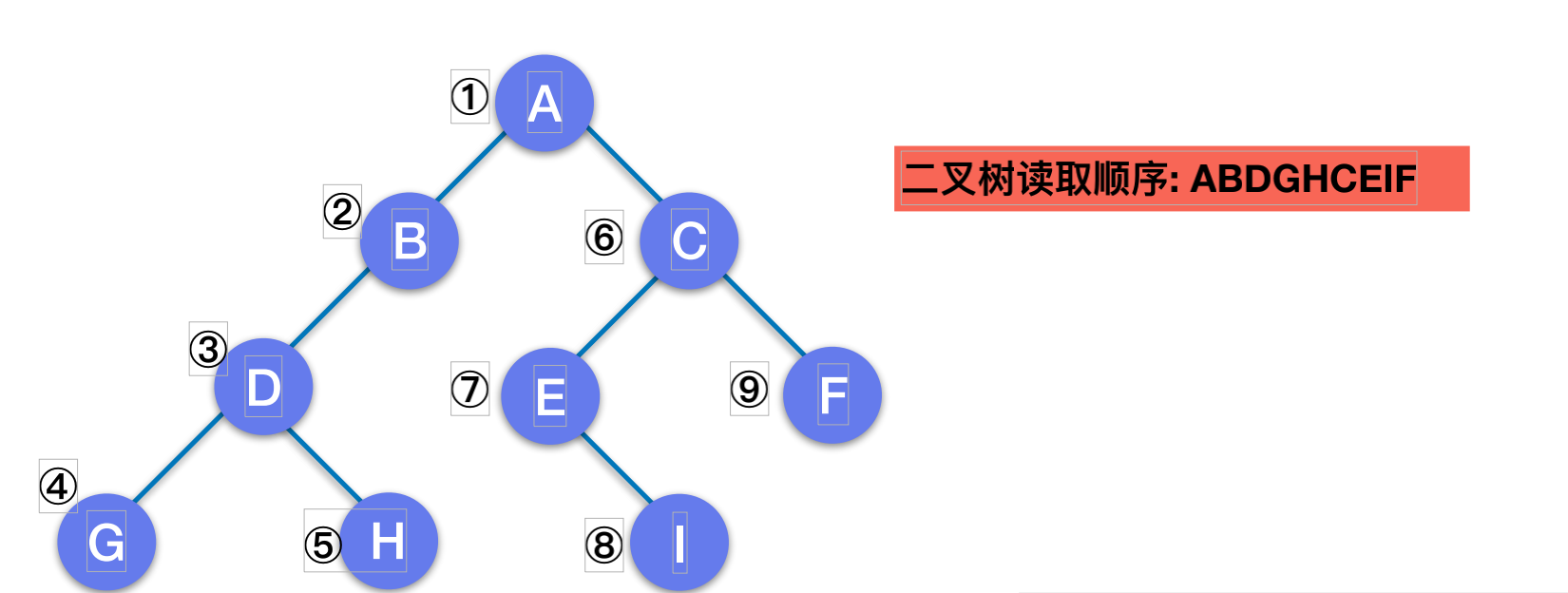 规则:若⼆叉树为空,则空操作返回;否则先访问根结点,然后前序遍历左⼦树,在前序遍历右⼦树