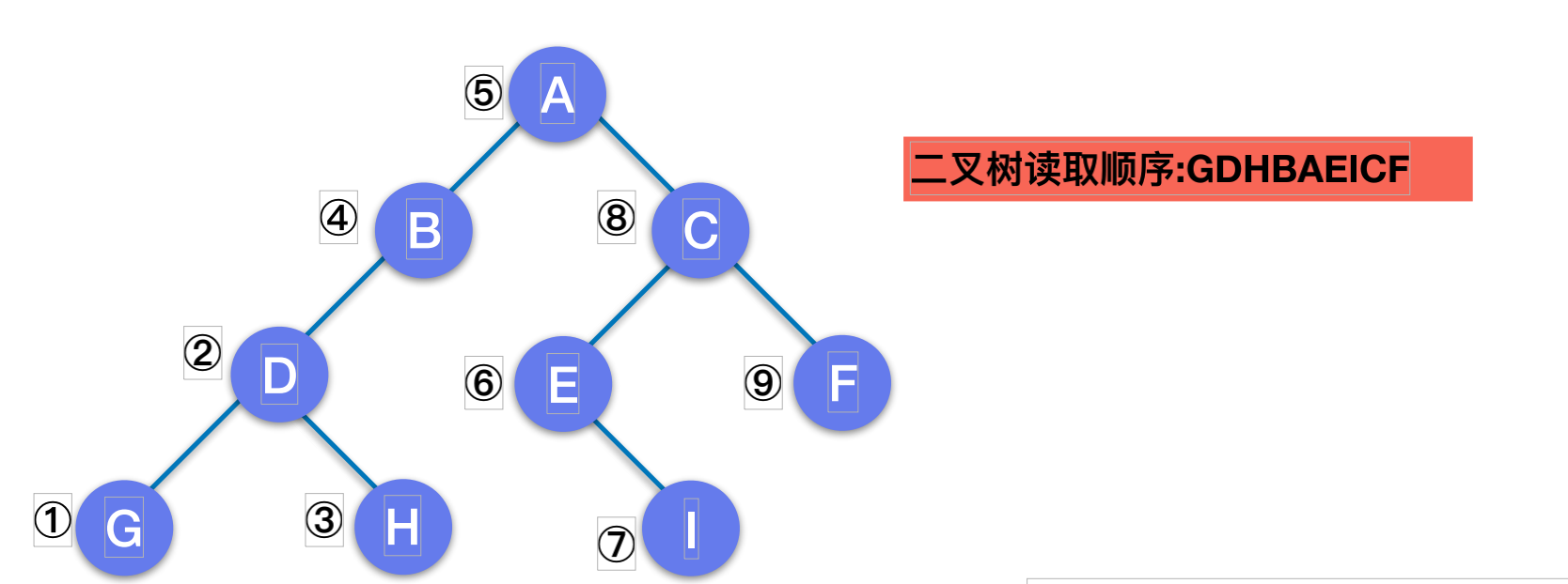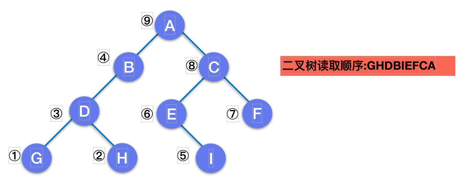 规则:若⼆叉树为空,则空操作返回;否则从左到右先叶⼦后结点的⽅式遍历左右⼦树,最后访问根结点
