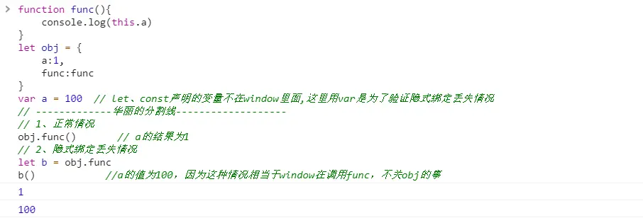var a = 100 // let、const声明的变量不在window里面,这里用var是为了验证隐式绑定丢失情况