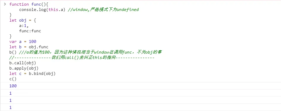b() //a的值为100,因为这种情况相当于window在调用func,不关obj的事