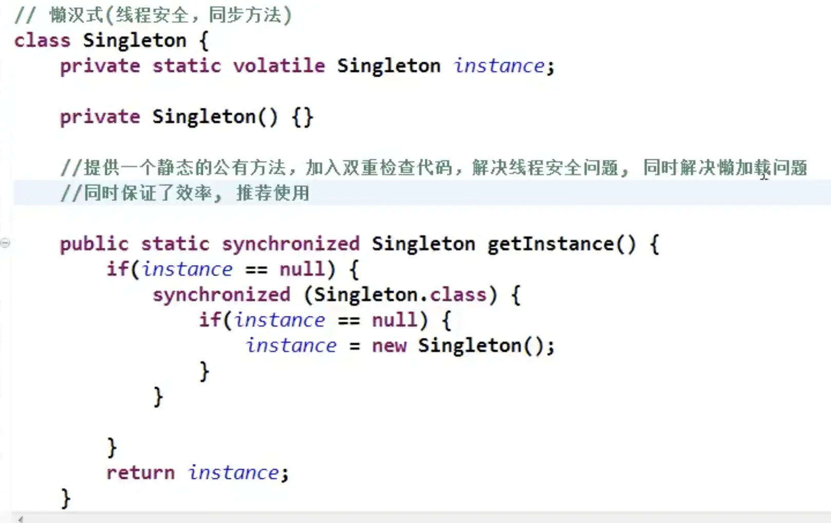 b.这样实例化代码只用执行一次,后面在次访问判断if(instance==null),直接return