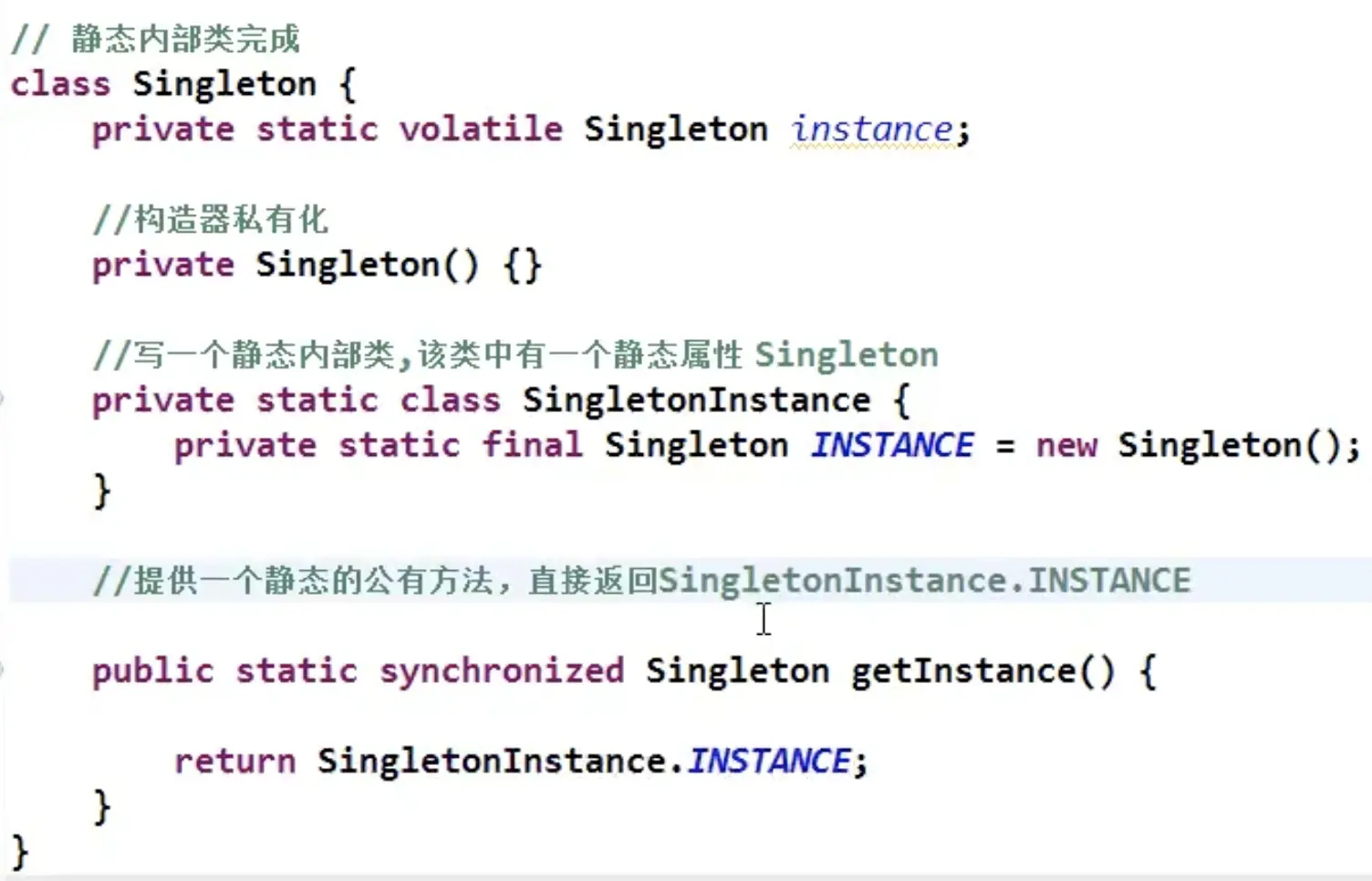 调用getInstance方法,才会装载SingletonInstance类,从而完成Singleton的实例化