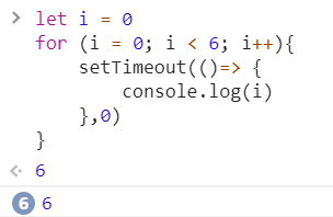 当第一次看见这个代码时,我理所当然的认为应该会打印出 0,1,2,3,4,5 但在chrome中运行时,却惊讶地发现该代码会打印出6个6