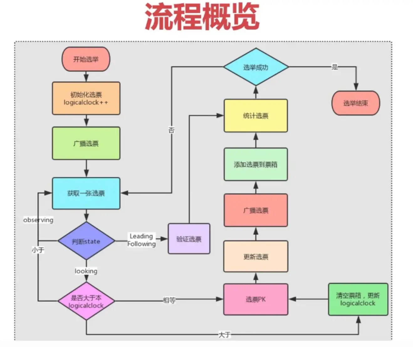 - 统计投票。完成选票归档后,就可以开始统计投票,统计投票是为了统计集群中是否已经有过半的服务器认可了当前的内部投票,如果确定已经有过半服务器认可了该投票,则终止投票。否则返回步骤4。
