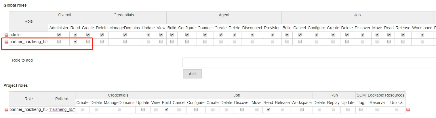 - [Manage Jenkins] -> [Manage and Assign Roles] -> [Manage Roles] 添加Role,需要注意Global roles的Overall Read权限必须勾选