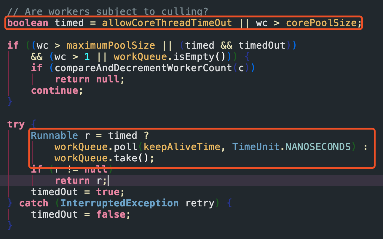 上面说到,getTask会阻塞线程。这和回收保留有什么关系呢?我们来看看这段代码