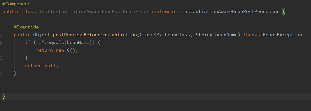 在 createBean 中调用了 resolveBeforeInstantiation 这个方法,目的就是给 BeanPostProcessor 一个返回代理对象的机会,比如下图将所有 beanName 名字为 a 的对象替换成对象 C