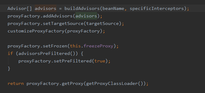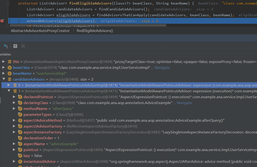 其中有一个是 AbstractAutoProxyCreator 的实现,调用它的 postProcessAfterInitialization 里面会调用 wrapIfNecessary,这个方法首先它会去找到所有候选的 advisor,然后判断当前类或者实例中的方法,是否满足 @PointCut 的表达式,将成功匹配到的 advisor 返回