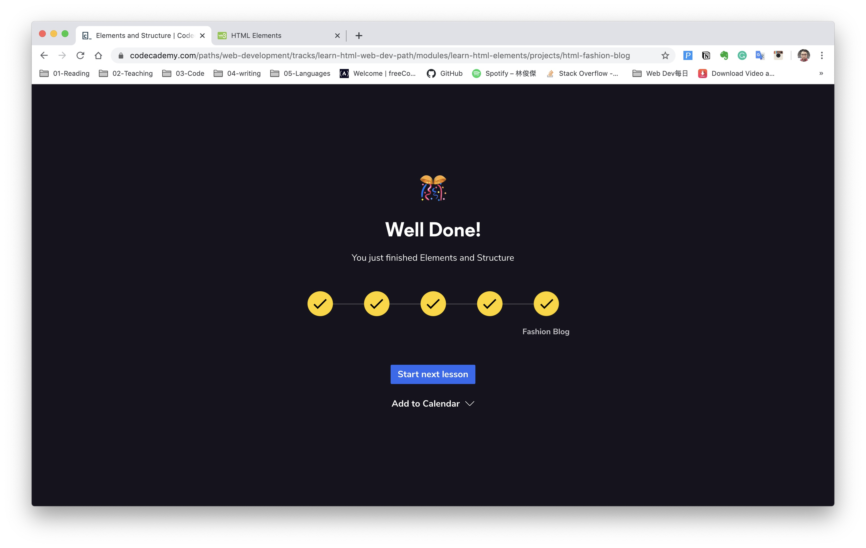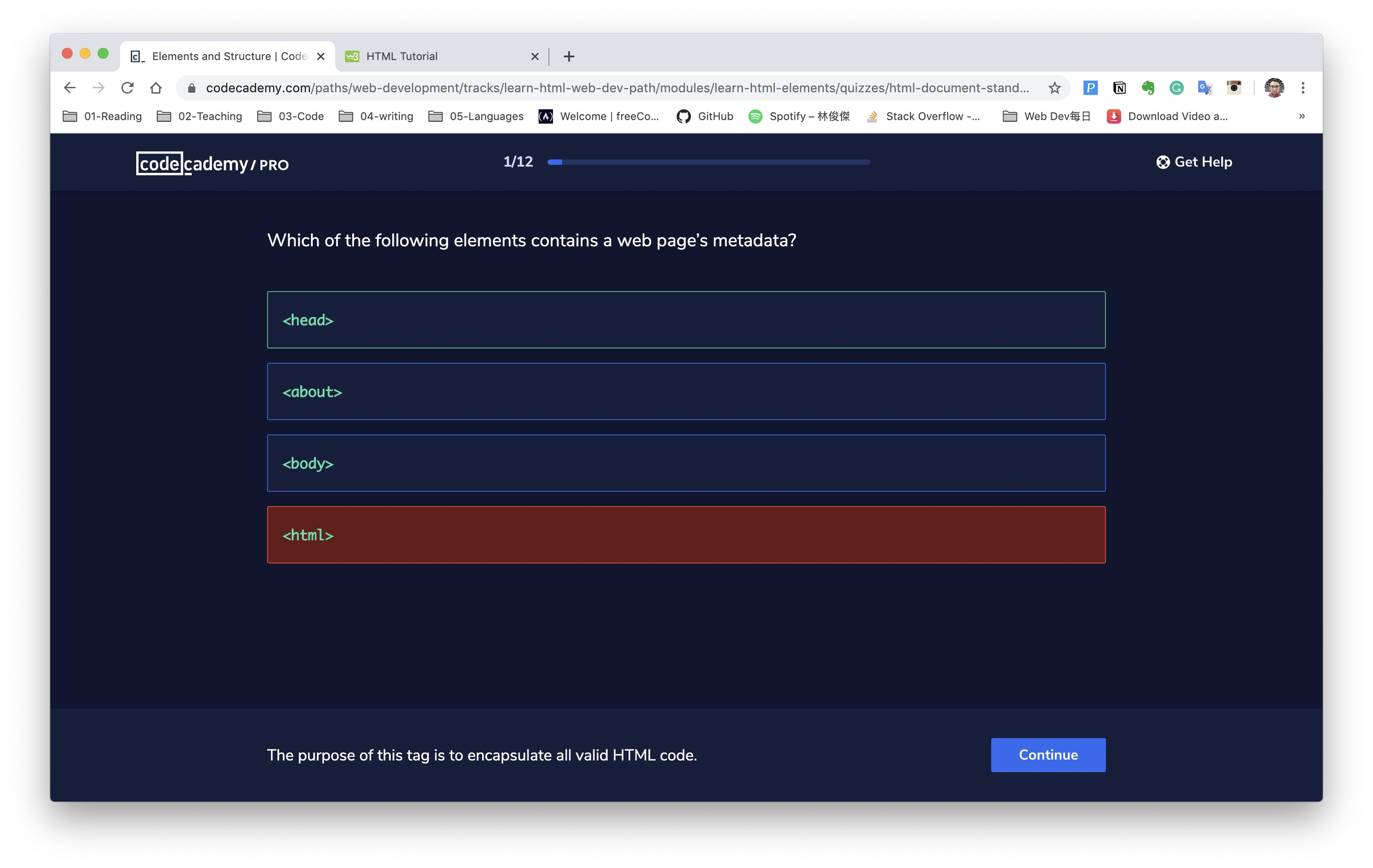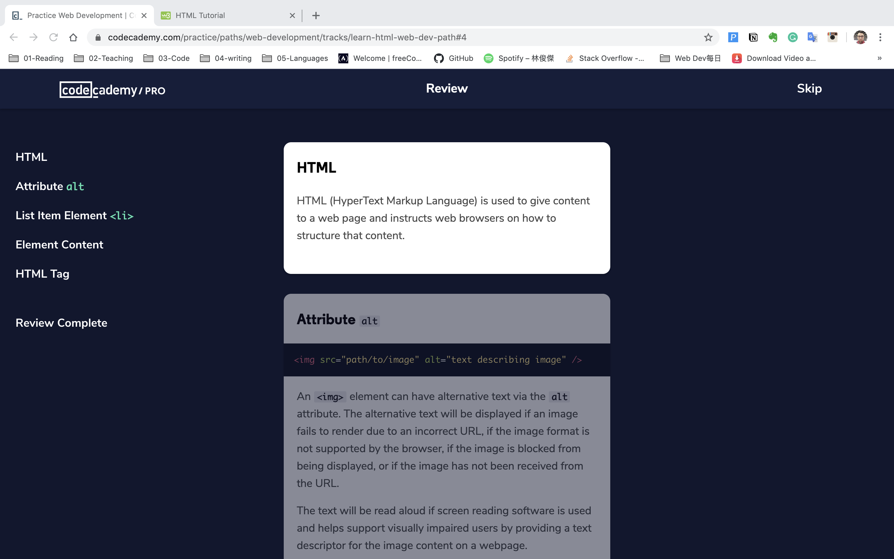 今天在CodeCademy的Web Development课程,学习了HTML的语法,结构,使用案例和进行每节课后练习。