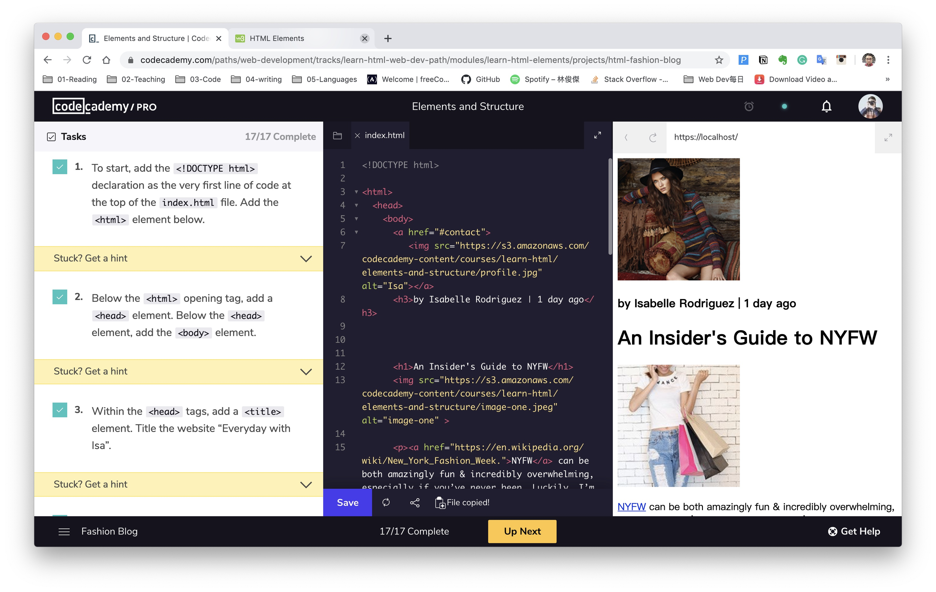 完成前面的基础知识后,最后是按照步骤,写代码制作一个简易的博客。基本上都是用前面学过的语法,不会超纲要求。(按步骤完成后,在左边打勾)