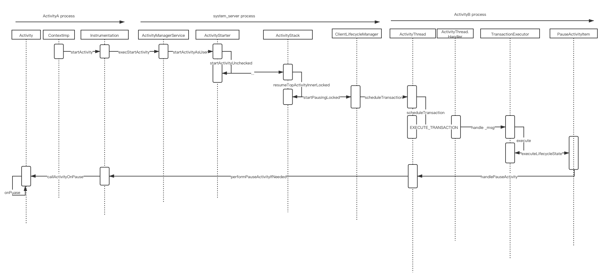 上图展示的ActivityA start ActivityB,然后回调ActivityA 的onPause方法。