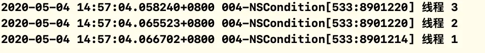 - 此时当前的线程 3 调用 [conditionLock lock]; 本质上是调用 [conditionLock lockBeforeDate:];,这里不需要比对条件值,所以线程 3 会打印