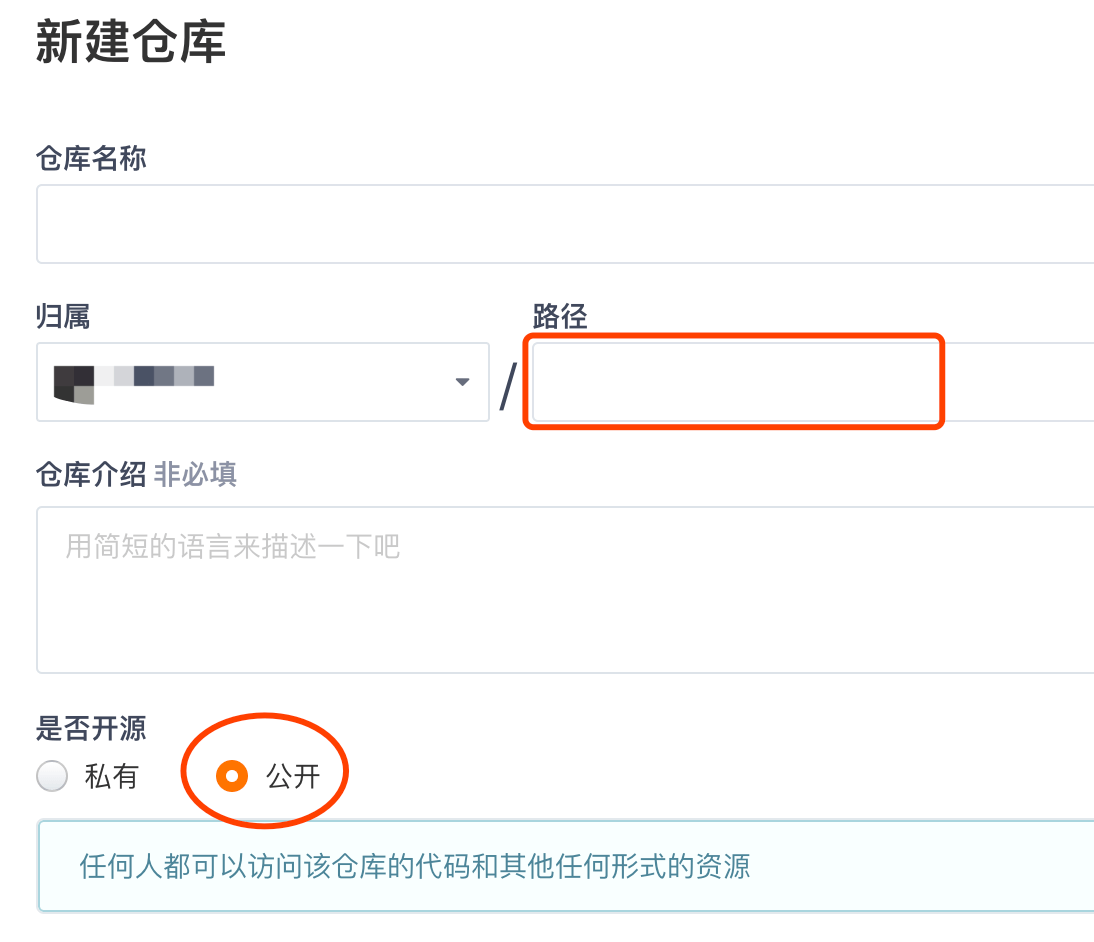 填写路径,即库名;选择公开;点击创建