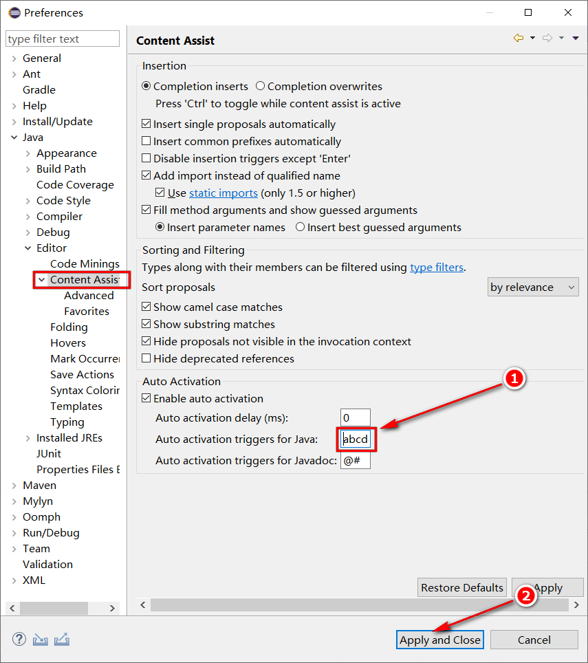 a. 打开 Eclipse → Window → Perferences窗口,设置Java → Editor → Content Assist属性。