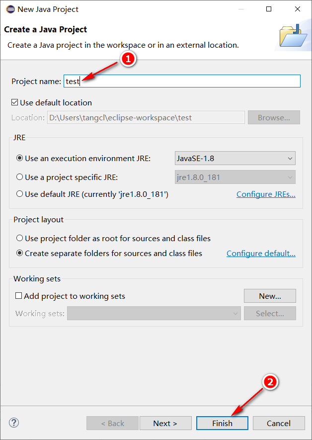 (3)新建一个名称为test的“Java Project”项目。