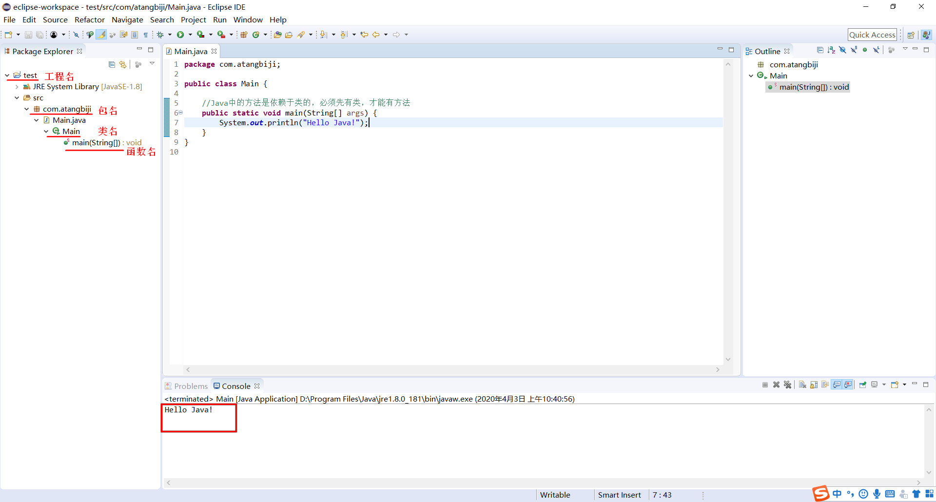 (5)在Main类中写一个程序的入口函数:main方法。